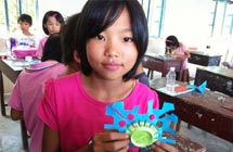 活動現(xiàn)場,孩子們盡情發(fā)揮自己的想象,用有限的廢紙、易拉罐等廢棄材料創(chuàng)造出了各種富有特色的手工藝作品。許多學生的創(chuàng)意作品超出了隊員們的想象,隊員們忍不住拍手叫好。雷州市烏石鎮(zhèn)三教小學六年級學生用日?梢姷囊桌奁吭O計出簡易的小垃圾桶。將平凡的垃圾桶擬人化,還在設計出來的垃圾桶上寫著“保護環(huán)境、愛護家園”等標語。二年級學生設計出的綠色太陽花,說那是一朵綠花,那是一個希望。