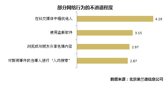 哪些行為在網(wǎng)絡(luò)世界中最不道德?調(diào)查顯示,“在社交媒體中騷擾他人”被認為最不道德;其次是“使用盜版軟件”;“瀏覽或與朋友分享色情內(nèi)容”以及“對新聞事件當事人進行人肉搜索”這兩項行為被認為處于“一般”和“輕微不道德”之間。