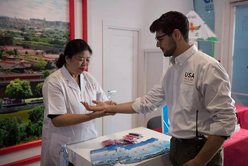 當薩仁在中國館尾廳進行綠色中醫(yī)針灸展示時,不時有好奇的游客上來體驗。一位在中國館交流的美國館志愿者也想親身體驗中醫(yī)針灸。短暫的號脈后,薩仁說:“這小伙子體格很好,就是手腳會在冬天發(fā)涼。”說著便幫美國館志愿者進行舒解經(jīng)絡(luò)的治療。