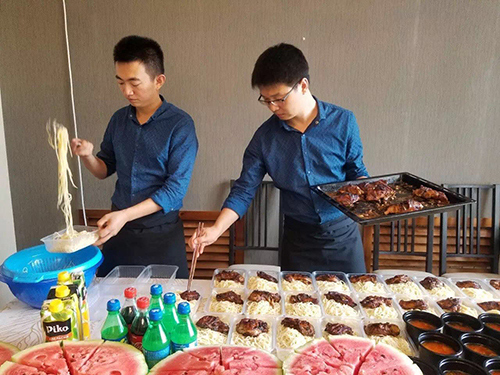 趁著兩位大廚張羅著分發(fā)盒飯的功夫,小編趕緊跟大廚交流起來。這兩位大廚分別是劉會彬和高德發(fā),都是名副其實的“90后”,別看年輕,兩位大廚的廚藝精湛,參與保障過青島國際啤酒節(jié)、國際象棋大賽等國際節(jié)慶活動及賽事。