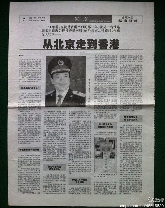 1997年對中國人來說,是難忘的一年。香港終于結(jié)束了英國殖民地身份,回歸祖國懷抱。為迎接這一歷史性時刻,1997年3月10日下午3點(diǎn),安徽蕪湖鐵路職工、涇縣人王鑫海背起一個大大的行囊獨(dú)自從北京西站出發(fā),踏上徒步京九線、迎接香港回歸的漫漫征程。