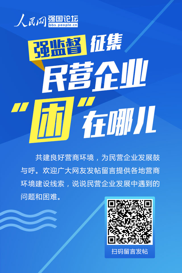 共建良好營商環(huán)境,為民營企業(yè)發(fā)展鼓與呼,人民網(wǎng)強(qiáng)國論壇開設(shè)“專項(xiàng)監(jiān)督”版塊,歡迎廣大網(wǎng)友發(fā)帖留言提供各地營商環(huán)境建設(shè)線索,說說民營企業(yè)發(fā)展中遇到的問題和困難,以期共同推動“糾正一些政府部門、大企業(yè)利用優(yōu)勢地位以大欺小、拖欠民營企業(yè)款項(xiàng)的行為”,為民營經(jīng)濟(jì)發(fā)展創(chuàng)造健康環(huán)境。