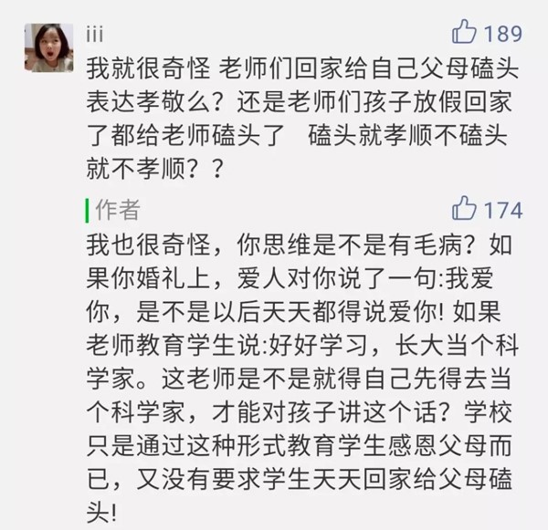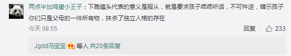 網(wǎng)友“兩點(diǎn)半加雞蛋小王子”:下跪磕頭代表的意義是服從,就是要求孩子乖乖聽(tīng)話(huà),不可忤逆,暗示孩子你們只是父母的一件所有物,抹殺了獨(dú)立人格的存在。