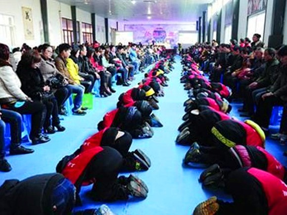 上海某民辦學(xué)校舉辦“孝敬文化節(jié)”“校園集體跪拜孝敬父母”場(chǎng)景(圖片源自網(wǎng)絡(luò))